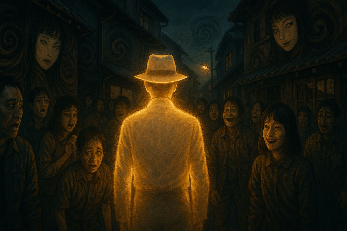 だがその中心に、白い帽子をかぶった男――斉藤一人さんが立っていた。彼はいつものようににこにこと笑い、町の人々と無数の富江をぐるりと見渡した。