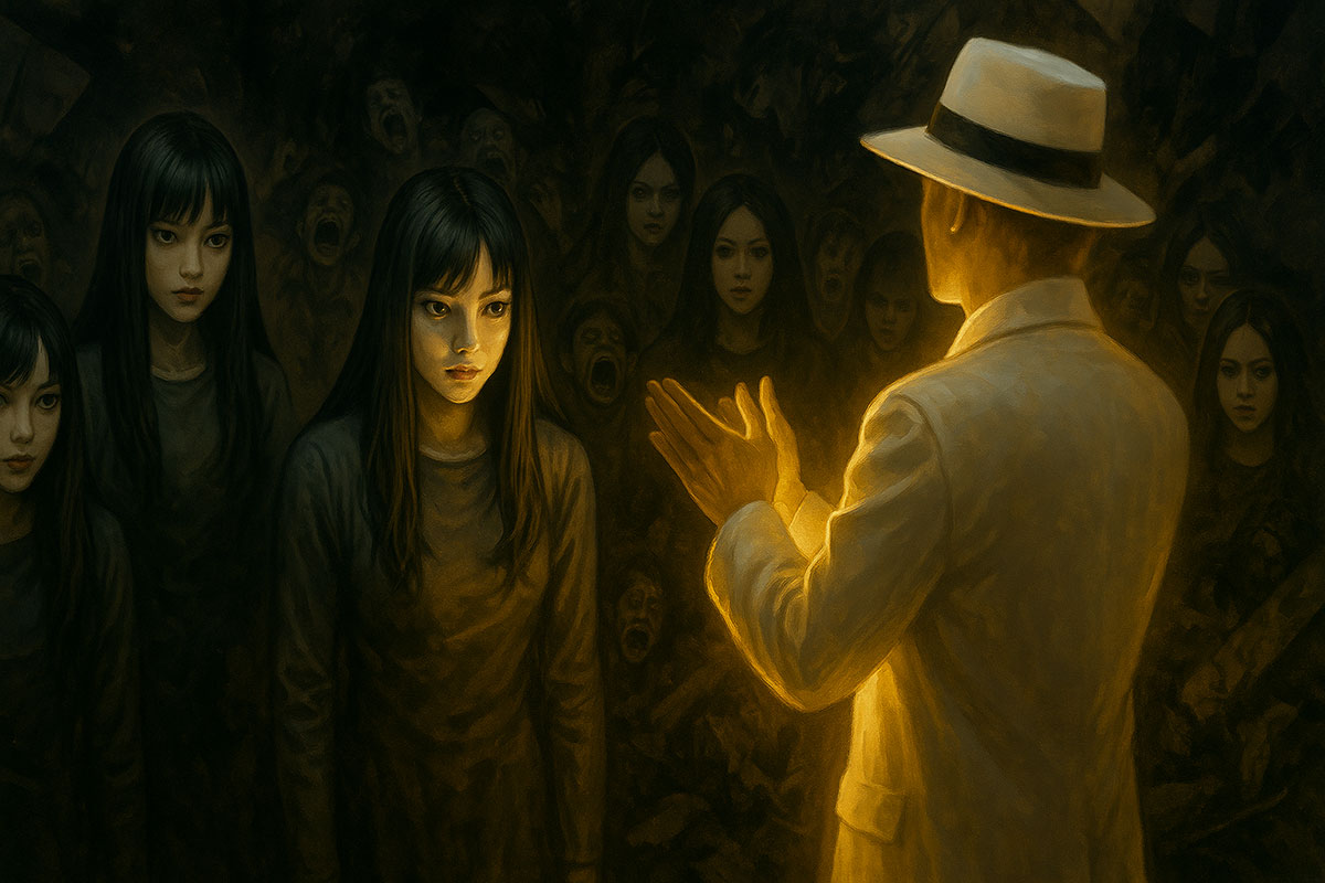 その声が広がると、不思議なことに、町に立ち並んでいた富江の群れが一瞬動きを止めた。鏡のように同じ顔が一斉に人々を見つめ、やがて少しずつ、表情が柔らかくなっていった。