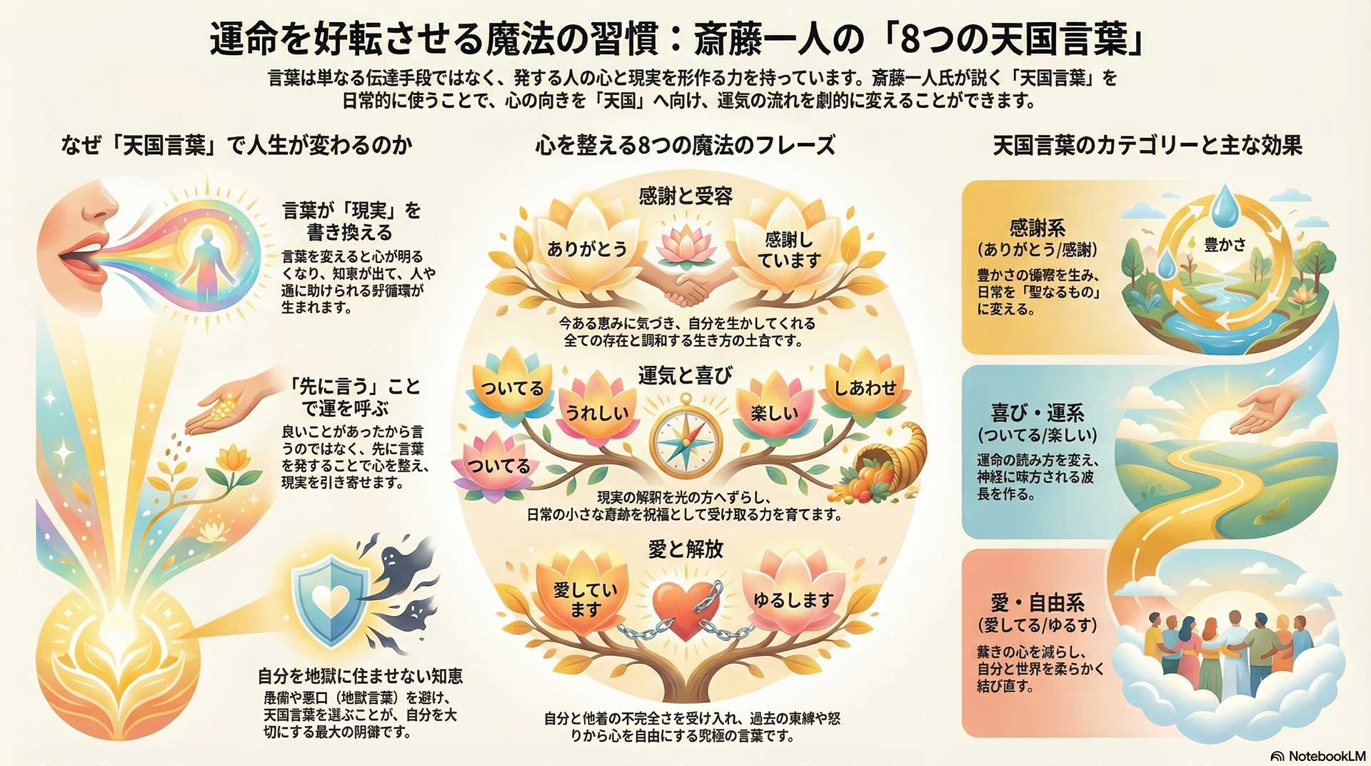 - 斎藤一人は、心を明るくし、運の流れを良くする言葉として語る