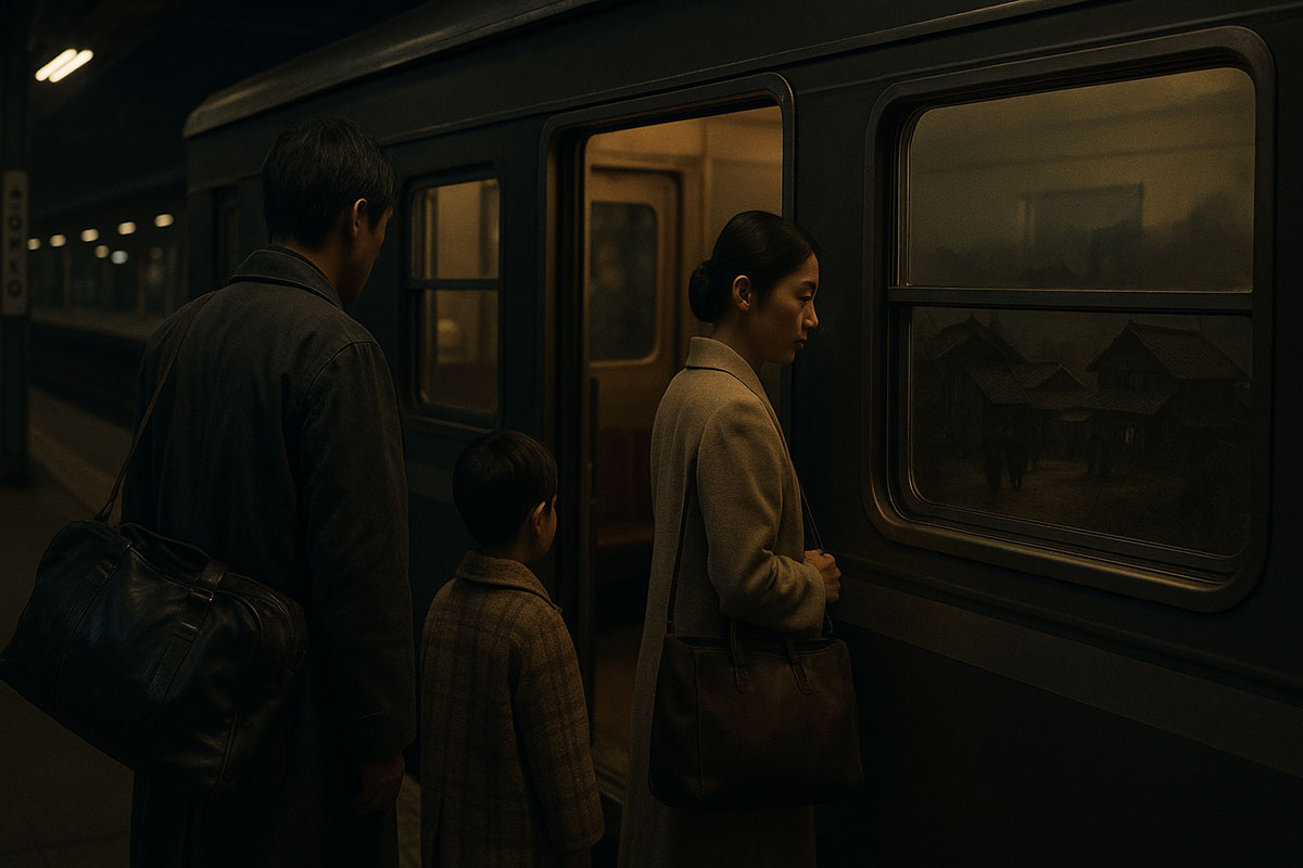 三郎、妻、子供二人が荷物を抱え、列車に乗り込む。