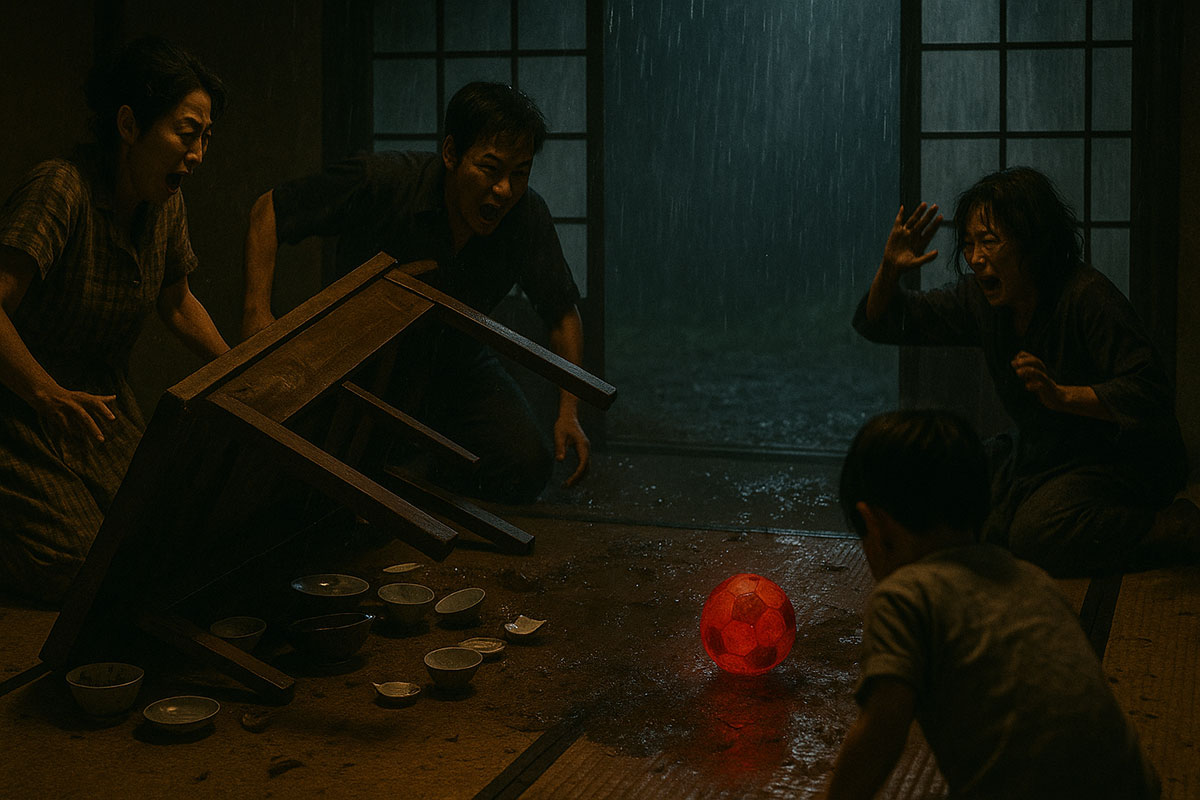 盃が割れ、食器が散乱し、親戚たちが悲鳴を上げる。